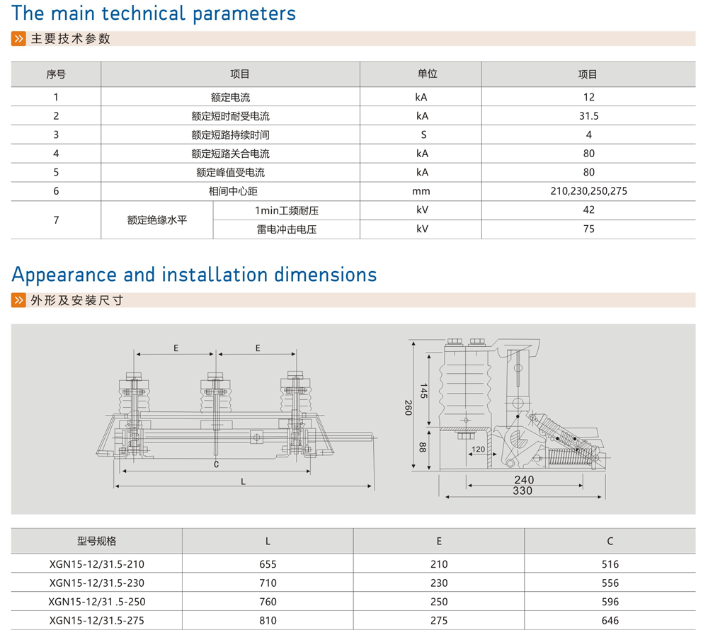XGN-12型户内高压接地开关是一种达到国内先进水平的产品。其性能符合GB1985-2004《交流高压隔离开关和接地开关》及IEC129的要求,适用于12KV及以下交流50HZ的电力系统中,可与各种型号高压开关设备配套使用,亦可作为高压电器设备检修时接地保护用。本型开关可与带电显示装置配套使用。